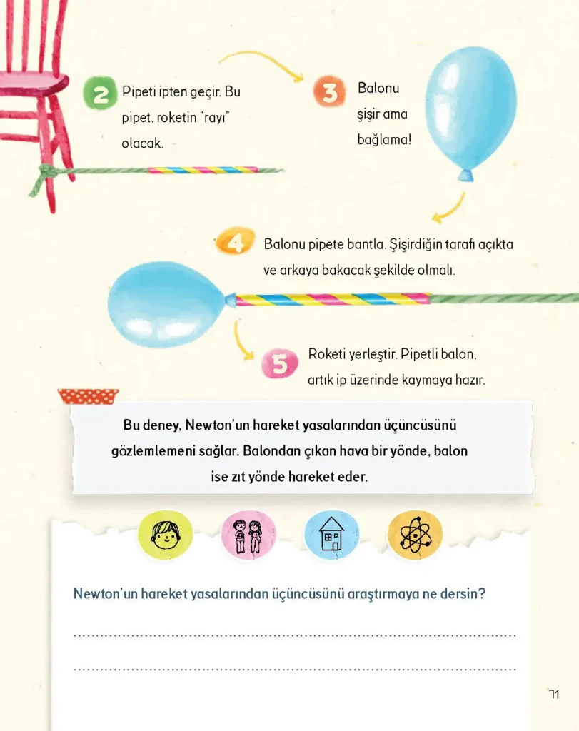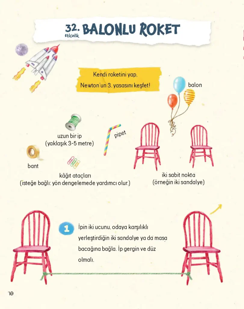 Bir balonun içindeki havanın çıkarken ne kadar güçlü bir itme gücü oluşturabileceğini hiç düşündün mü? Bu basit etkinlikle kendi balonlu roketini yapabilir ve Newton’un 3. yasasını eğlenceli bir şekilde keşfedebilirsin.