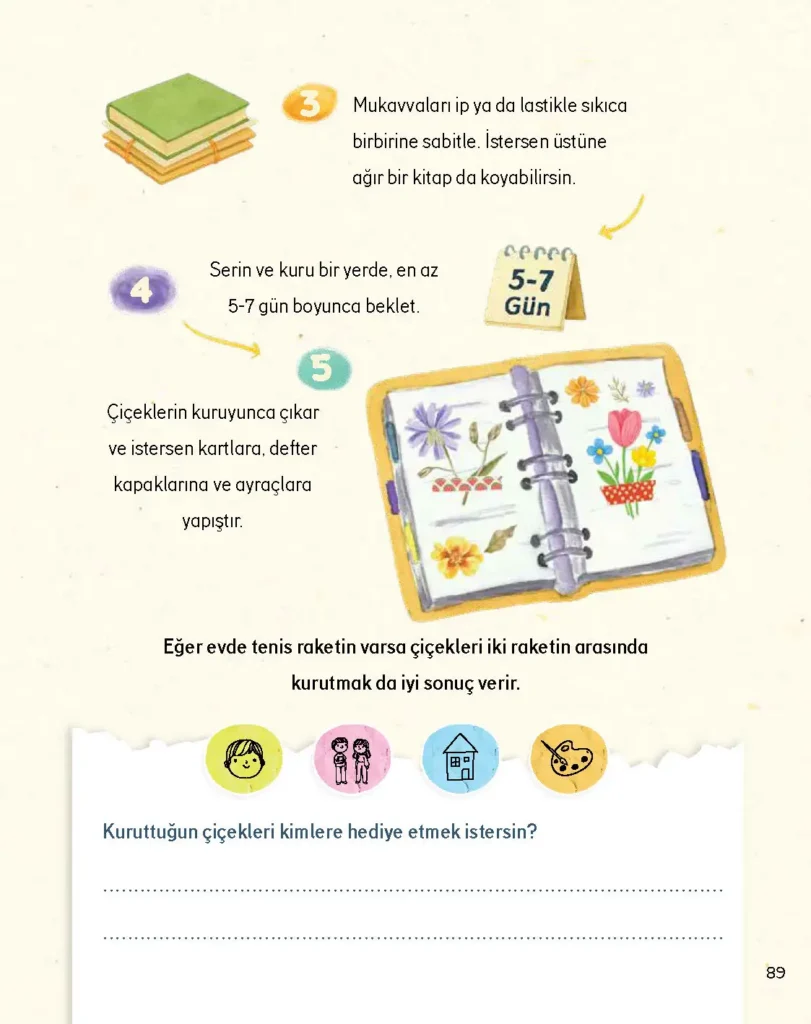 Çiçekler kuruduktan sonra onları çıkar ve istersen defter kapağına, kartlara veya ayraçlara yapıştırarak kendi tasarımını oluştur.
